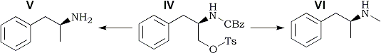 Starting from D-phenylalanine, dextroamphetamine sulfate and methamphetamine hydrochloride were synthesized. The reaction sequence proceeds through three intermediates, in which the absolute configuration of the asymmetric carbon atom is changed but the relative configuration remains the same. Either product can be obtained from a common intermediate by altering the reductive conditions employed for the removal of a carbamate protecting group. Following initial observations on the sympathomimetic properties of amphetamine and related compounds1-4, the racemate of amphetamine was introduced into clinical medicine for the relief of nasal congestion5. The (S)-(+)-isomers of amphetamine [dextroamphetamine (V)] and methamphetamine (VI) (Scheme I) have been used in the therapy of obesity, narcolepsy, parkinsonism, and certain behavioral disorders6. Considerable interest also has been generated in the central stimulant properties of these compounds7.