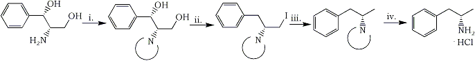 Optically active (S)-(+)-amphetamine hydrochloride (5·HCl) was prepared from (1S,2S)-2-amino-1-phenyl-1,3-propanediol (1) via its 3-iodo intermediate (3). A phthaloyl group was used for protecting the amine function.