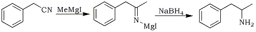 The alkylation of benzyl cyanide (phenylacetonitrile) with methylmagnesium iodide affords a complex salt of Phenyl-2-iminopropane, which is directly reduced to racemic amphetamine using sodium borohydride. No attempt is made to isolate the intermediate as it easily hydrolyses to phenylacetone and ammonia at neutral or acid pH. The inverse alkylation of acetonitrile with benzylmagnesium chloride yields the same intermediate imine complex, which of course can be reduced in the same fashion as described below.