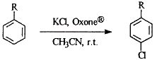 ArCl + H2OIn conclusion, we have developed a novel system for the regioselective oxychlorination of aromatic compounds by using KCl and Oxone in acetonitrile under ambient conditions. The results reported here demonstrate that reagent system possess considerable practical advantages over traditional reagents for electrophilic chlorination reactions. The commercial availability of the reagents and reactions are clean, high yielding and work-up is simple. The absence of side chain chlorination products in reaction conducted in acetonitrile suggests a substantial increase in the rate of the ionic process. We are currently extending this methodology to other halogenation reactions.