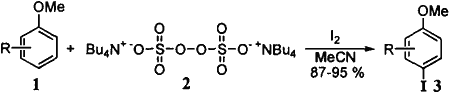 We have found a practical and regioselective aromatic iodination: a combination of tetrabutylammonium peroxydisulfate ((TBA)2S2O8) and iodine has been found to be an excellent reagent for the efficient iodination of aromatic compounds such as methoxybenzene, phenol, and aniline in acetonitrile under mild conditions (Scheme 1). This reaction has an advantage to be carried out at 20°C under the neutral condition in acetonitrile.