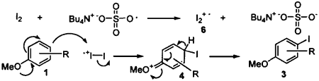 The reaction mechanism is not clear, but it may be explained by one of the two possible pathways. The sulfate free radical produced by homolytic cleavage of (TBA)2S2O8 may oxidize iodine via a one electron transfer to produce the iodonium cation radical 6. The electrophilic attack of the iodonium cation radical at the p-position of methoxybenzene produces the intermediate 4, which is rapidly oxidized to the iodinated methoxybenzene 3 (Scheme 2). Another alternative pathway is that the sulfate free radical oxidizes methoxybenzene by one electron transfer from it to produce the phenyl cation radical 5 that reacts with iodine to form the adduct intermediate 4, followed by oxidation to 3 (Scheme 3). The scope and reaction mechanism is under investigation.
