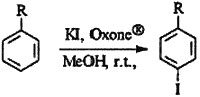 A typical oxyiodination of an aromatic compounds in the presence of Oxone proceeds according to the stoichiometry of Eq. 1. It is believed that the iodination proceeds via the formation of hypoiodous acid. The hypoiodous acid has higher instability due to pronounced ionic nature and thus more reactivity towards the aromatic nucleus. The absence of iodination of the ring methyl group (Table 1, Entries 11-13) is indicative of the electrophilic mechanism of the reaction rather than a radical pathway.
