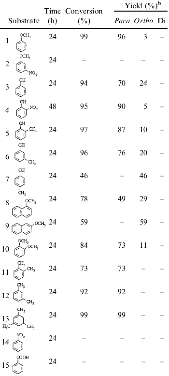 Although halogenation of aromatic compounds with halogens is well known reaction, bromination and chlorination easily proceed with or sometimes without Lewis acid catalysts, but iodination usually more difficult to take place. Except for active substrates, oxidizing reagents such as nitric acid, iodic acid, sulfur trioxide, sulfuric acid and hydrogen peroxide must normally used in order to generate a better electrophile6 by oxidation of molecular iodine. It was also reported that the aromatic iodination with molecular iodine was catalyzed by stoichiometric amounts of metal halides, such as AlCl3–CuCl27, or SbCl58, and a direct iodination was carried out by using NH4I and catalytic amounts of NOBF4 in CF3COOH/CH2Cl2 or CF3COOH/CH3COOH with molecular oxygen9. These procedures suffer some deficiencies. The most serious of these are substrate limitations due to reaction conditions and the loss of iodine from the reaction as hydrogen iodide or metallic iodide.