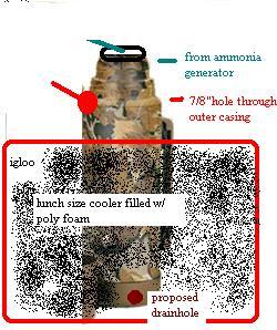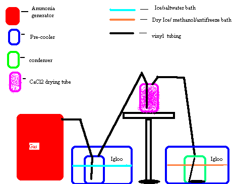 A plastic gas can is used here as the generator. This is used because the soft sides allow you an idea of the system pressure. There are many other containers which may be used, but I cant think of any which are as forgiving. While generating, the system pressure will fluctuate. If your system cannot take 20 PSI, then you should redesign it. During normal operation it should run 5-7 psi. The principle of this operation is that " the stronger base liberates the weaker base from it's salt." If your salt is ammonium chloride, then you would add sodium hydroxide to it to liberate the ammonia. the reaction goes: NH4CL+NaOH = heat + NaCl + H20 +NH3. The reaction requires a small amount of water to initiate, but once it starts it produces it's own water (as well as salt). Notice that the reaction produces heat (exothermic) as this is gonna be important later. To produce a liter of ammonia you will need about 2 kilos of ammonia salt, as well as 2 kilos of NaOH. This is a theoretical minimum. When buying fertilizer, look for "ammoniacal nitrogen". Forget "total nitrogen" or "urea". If your fert is 20% ammoniacal nitrogen, then you will need 10 kilos minimum to produce a liter. If you shoot for a liter, you will likely make 1/2 that much. The amount of water required to initiate the reaction is quite small. If you live in a humid climate, you wont have to add any. As water is produced, it absorbs NH3. wherever you have water in the system you will have lots of nh3. This includes in your drying tube. That is why your salt and NaOH should be added dry. Now, your ammonia generator is for the most part a closed system. The NH3 is going to expand from the generator, and shrink as it cools on the way to the condenser. So your generator is humming along, producing heat, gas, and water, until it reaches a point at which there is so much water being created that it stops pushing ammonia. The water then begins to cool, and as it cools, becomes capable of holding even MORE ammonia. Suddenly, your reaction that was pushing ammonia is now PULLING ammonia. This is "suckback". When your system starts to suck, you should, quick as a bunny, open your generator. If you do not, then the ammonia from the condenser will be sucked back into your drying tube, and you will wish to god you had just scraped the damn matchbooks. This is a good time to recharge the generator. WARNING ABOUT AMMONIA: Ammonia will seek out and bond with any nearby water. This means your eyes and airway. You should always have a few gallons of water handy to dowse yourself with, as it may save your life. One breath of concentrated ammonia vapor is enough to burn your trachea and make it impossible to breathe. High concentrations of ammonia (above 15%) are explosive. Keep this in mind when its time for your mid reaction toke. Gas law says that 1 mole of any gas will occupy 22.4 liters of volume at standard temp and pressure. A mole of ammonia is 17 grams. In short, it takes very little ammonia to fill up a room. Anhydrous ammonia is liquid at standard pressure only below -33c (-28f). This temperature is quite sufficient to freeze various body parts. Do not drop money into your ammonia. It will shrink (thank you slydog for this contribution). Be sure your connections are airtight BEFORE making/using ammonia. A seemingly minor leak smaller than a pinhole will evacuate a room. If there is a problem with ammonia, dump water on it and GET AWAY. Hold your breath till you are sure your clear. DISSECTING THE AMMONIA GENERATOR GENERATOR: (the "gas can"). This is where the ammonia is liberated from the salt. It is important to realize that this part of the unit requires CONSTANT attention. The preffered method is to start off with 20 ml or so of water (you may also use aqua ammonia for a little extra kick). pour a layer of DRY ammonia salt on top, then add the NaOH and quickly seal the unit.the salt and lye are added dry so that they do not react too rapidly. once the unit is sealed, begin shaking to mix the fert/lye. within a minute you will see the generator beginning to pressure up. Shake intermittently to maintain a constant, moderate pressure. The best way to determine the right pressure is to pay attention to the condensor pressure relief valve. When ammonia fumes begin to emit strongly, back off the pressure till there is only a very faint amonia odor from the relief. Be sure to layer your fert/lye in the proper ratio, with a slight excess of NaOH. So for a 20% fertilizer, you would add about 1/4 lb of NaOH for each LB of fert. Small layers work best. You will be recharging every 15-30 minutes on average. This process takes time. Expect to wait an hour for your first ML of ammonia. Mr Cleans first attempt required about 8 hours to generate 500 ml. It also took almost 30lbs of fert and 7 lbs of NaOH, as well as 25lbs of dry ice. It gets easier, though. The generator will get hot. expect temps around 140-150f. The generator must be watched constantly. It can go from positive to negative pressure in less than 1 minute. If you have to take a leak, don't dally. After you have been running it for a while, condensation will form in the hose coming from the generator. (it should form a U shape before going to the precooler) You can watch the water droplets to get an idea of the flow rate. PRECOOLER: when your ammonia exits the generator, it will be around 140f. to condense ammonia, you will need to cool this below -28f, in other words, its gotta drop almost 170 degrees. You will be there an extra day or two if you expect your condenser to do ALL the work. When the hot ammonia is generated, it carries a substantial amount of moisture as well. The precooler will capture a good portion of this, ensuing that your drying tube does not get overloaded. The precooler cools in two ways. Firstly by heat transfer to the ice bath, and secondly by expansion of the gas. As water condenses here, it will trap ammonia with it. Due to the low water temp, this will be about 7