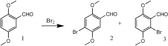 A cold solution of 20.0 g (0.12 mol) of 2,5dimethoxybenzaldehyde in glacial acetic acid (115 mL) was treated with 20.0 g of bromine in glacial acetic acid (60 mL). The solution was stirred at room temperature for 2-3 days and diluted with ice water. The yellow precipitate was collected by filtration and dried (28 g, 95%), mp 118-126°C (lit.1 mp 125-126°C). Recrystallization from ethanol gave 15.2g of 2, mp 132-133°C (lit.2,3 mp 132-133°C). Ethanol was removed from the mother liquor in vacuo and the residue was subjected to column chromatography (silica gel, benzene). The solid (10.4 g) collected in initial fractions was 4-bromo-2,5-dimethoxybenzaldehyde (2), total yield 25.6g (87%), mp 132-133°C. Subsequent fractions gave 1.5g (5%) of 6-bromo-2,5-dimethoxybenzaldehyde (3), mp 102-103°C (EtOH).