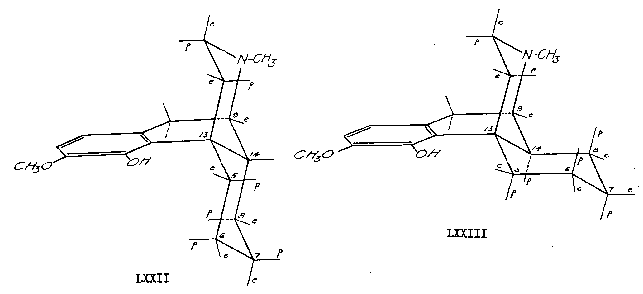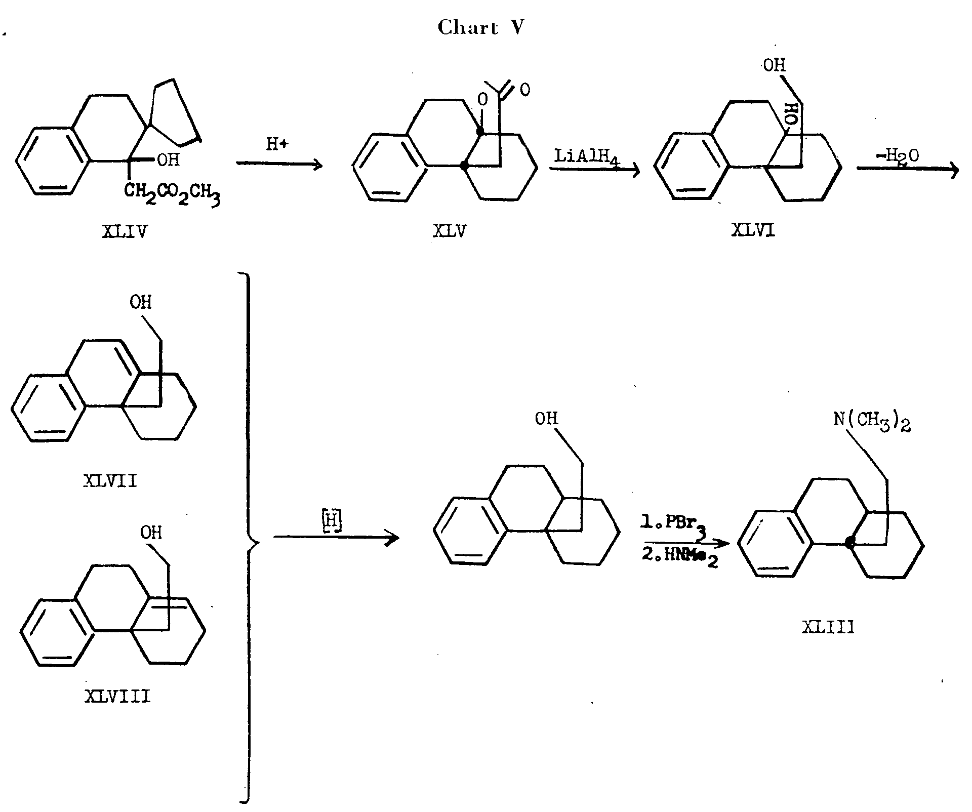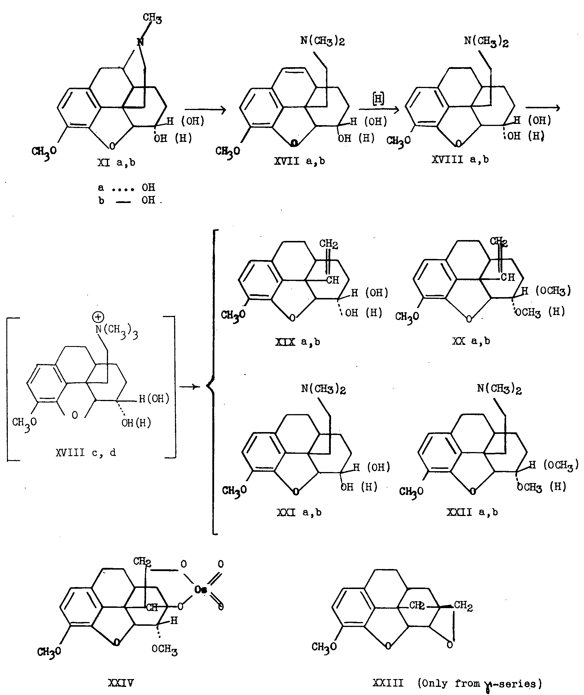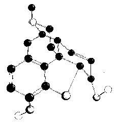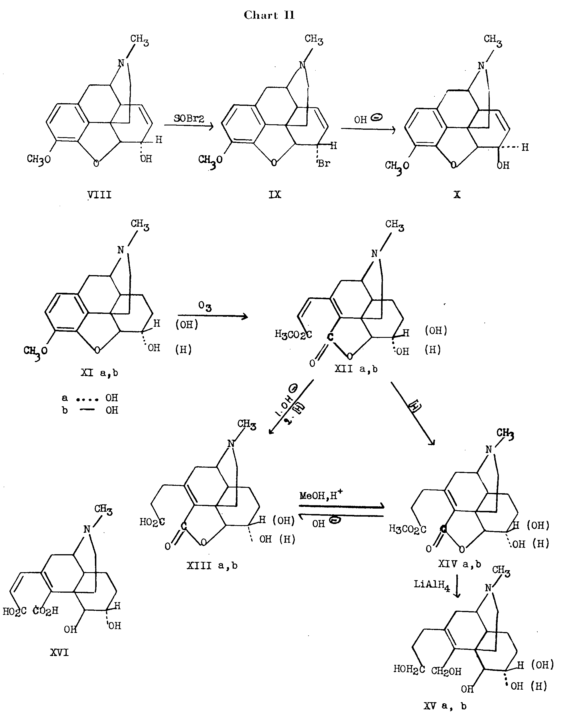 In this review, the fine stereochemistry at the various asymmetric centres in the morphine molecule will be discussed on the basis of degradative evidence. The information gleaned from various synthetic approaches to morphine will also be discussed, in so far as it may elucidate the steric configuration of the alkaloid or of certain of its degradation products. Since it is clearly established that morphine and its methyl ether, codeine, are members of the same stereochemical series, much of the evidence obtained for the configurational relationships in codeine or its degradation products (used primarily because of their greater stability as compared to the corresponding unmethylated compounds) will apply equally to morphine. ![]() Morphine has five asymmetric carbon atoms: C 5, C 6, C 9, C 13, C 14 (for the numbering system, see structure Ia). The appearance of the molecule in space may be visualized more readily from the above artist's conception. 1 1. The artist's drawing shows the basic skeletal structure of morphine. Most of the hydrogen atoms are not shown. We acknowledge with thanks the co-operation of Mr. Amnon Rubenstein in preparing this drawing. Emde [1] 2 arranged the atoms of morphine in the manner indicated by structure Ib, in order to emphasize the similarity of the straight chain made up of the five asymmetric centres, to the cyclic forms of aldoses. This formulation is of interest only in that it points out this relationship. It is not useful as a spatial representation of the molecule. ![]() From a study of the optical rotations of certain of the opium alkaloids and their derivatives and employing the principle that the molecular rotation is an additive function of the rotations at the component asymmetric centres, Emde concluded that three of the five asymmetric carbon atoms (C 5, C 6, C 9) rotate the plane of polarized light to the left (-) and the remaining two (C 13, C 14) do so to the right (+). This work shows that the configuration of morphine is the same as in one of the two cyclic forms of aldoses in which the five asymmetric centres are arranged according to the scheme: (-)C 1; (-)C 2; (+)C 3; (+)C 4; (-)C 5, or according to the inverse scheme: (-)C 1; (+)C 2; (+)C 3; (-)C 4; (-)C 5. Although these rotational contributions (+ or -) have been assigned to the asymmetric centres, it must be pointed out that this assignment provides no information as to the actual configurations. Bick (1 a) has recently published a preliminary note in which it is suggested on the basis of rotation displacements that morphine is related to L (+) tartaric acid in its absolute stereochemical configuration. 2. Arabic figures in parentheses indicate items within the list of references to be found at the end of this article. ![]() Sch?pf and Pfeifer [2] , on the basis of a study of models, interpreted the fact that dihydrocodeinone (II)3is formed exclusively from dihydrothebainone (III) by oxide ring closure at C 5, as indicating that the C 5-O bond is transto the ethanamine bond at C 13. The hydrogen at C 14 was inferred to be cis to the ethanamine bond at C 13 by analogy to the situation prevailing in the 14-hydroxy compound. Since degradation of dihydro-14-hydroxycodeinone (VI) to nitrogen-free material resulted in the formation of a cyclic ether (VII) involving the hydroxyl group at C 14, the hydroxyl and the ethanamine bridge must be cisto each other (see chart I). ![]() 3. Roman numerals in parentheses indicate reference to structures to be found within the charts. If we assume that the 14-hydroxyl group and the 14-hydrogen in related compounds, possess the same configuration, the hydrogen at C 14 must also be cisto the ethanamine chain. Gulland and Robinson [3] suggested that hydrogen peroxide causes 1,4-hydroxylation of the diene system of thebaine (IV) with subsequent elimination of methanol to form the C 6 carbonyl group. There is no ironclad proof showing that the C 14 hydrogen in morphine and codeine has the same configuration' as the C 14 hydroxyl in 14-hydroxycodeinone (V). Sch?pf assumed that the probability for identical configuration at C 14 in both cases was high because hydrogenation of the 8,14 double bond in various compounds of this series, proceeds in only one steric sense. A study of models indicated that when the hydrogen atom at C 14 is cisto the ethanamine bridge a strain-free system can be obtained. Although compounds having the opposite relationship are known (vide infra), this reasoning, although not affording conclusive proof of the point, was shown to be correct when later work had been carried out by Rapoport and co-workers, who conclusively clarified the configurational relationships of all the asymmetric centres of the morphine molecule. Rapoport and Payne [4] undertook to determine by absolute methods, the relative configurations at the various asymmetric carbon atoms of morphine. To determine the relative configuration at C 5 and C 6 the oxide ring was opened at C 4 rather than in the usual manner at C 5 (chart II). A pair of vicinal glycols (at C 5 and C 6) would result from dihydroco-deine (XIa) and dihydroisocodeine (XIb), respec-tively, and their configuration could be determined by usual reagents used for differentiation between cis and trans diols. ![]() Dihydrocodeine (XIa) was prepared by reduction of codeine (VIII) and dihydroisocodeine (XIb) was prepared in 35 per cent over-all yield by reduction of isocodeine (X), which in turn was obtained from codeine (VIII) by treatment with thionyl bromide to yield bromocodide (IX)4followed by hydrolysis to the alcohol. The transformations carried out with the isomeric pair, dihydrocodeine and dihydroisocodeine are summarized in chart II. Dihydrocodeine (XIa) and dihydroisocodeine (XIb) differ only in the relative configuration of the hydrogen atom and the hydroxyl group at C 6. In the former, the hydroxyl is represented by the dotted bond (below the plane of the paper) and the hydrogen by the solid bon