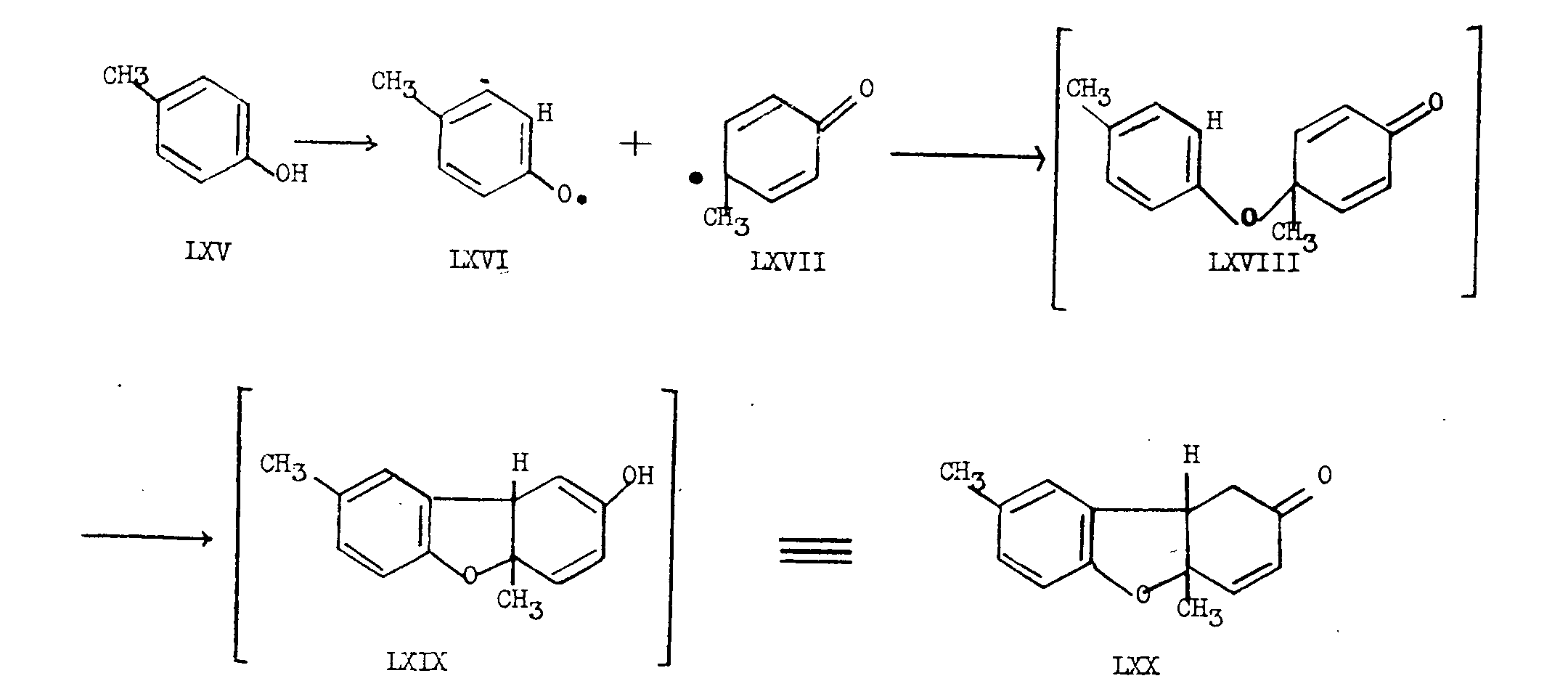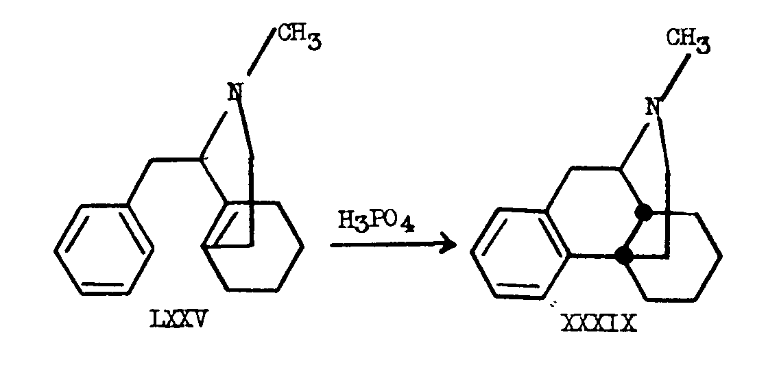 Chart VII![]() Also worthy of note, stereochemically, is the cyclization reaction discovered by Grewe [16] in which a product of preponderantly cis configuration is formed at C 13-C 14. In 1928, Robinson [19] proposed a possible biogenetic relationship between the morphine group of alkaloids and those of the 1-benzylisoquinoline group such as laudanosine (LXIII). The biogenetic conversion of a completely demethylated laudanosine precursor (LXIV) to morphine, requires the formal addition of two hydrogen atoms followed by the loss of the elements of one molecule of water. Robinson's hypothesis is extremely attractive since laudanosine (LXIII) can be formed by simple methylation of the precursor LXIV and the conver- sion of the latter to morphine involves reactions, for which most probably, enzyme systems exist in the plant. ![]() Chart VIII ![]() Sch?pf has recently published a modified biogenetic scheme which relates the morphine alkaloids to the 1-benzyl-isoquinoline group [20] . This scheme is based on the analogy to the dehydrogenation reaction, investigated by Pummerer and co-workers [21] , in which p-cresol (LXV) is converted to the angularly substituted furan derivative LXX, presumably as shown in chart VIII. In this formulation, it is suggested that p-cresol (LXV) gives a radical which reacts partly in the aryl-oxy form LXVI and partly in the &gamma-keto-methyl form LXVII, so that when the free valences unite to give LXVIII the hydrogen atom ortho to the oxygen in the aryloxy portion of LXVIII adds intramolecularly 1,4 to the ends of the enone system in the &gamma-keto-methyl portion to give the intermediate LXIX. LXIX is immediately transformed to the stable LXX by ketonization. Chart IX![]() Analogously, Sch?pf visualizes an intermediate LXXI differing slightly from Robinson's precursor, which must be dehydrogenated to the biradical LXXIIa or LXXIIb. In this case, when the free valences unite intramolecularly, we obtain by 1,6-addition to the ends of a dienone system which differs from the p-cresol case in that it contains an &alpha-keto-methyl system (see LXXIIb), the hypothetical precursor LXXIII. This formulation is summarized in chart IX. It will be seen from chart IX that the precursor LXXIII can very easily afford morphine, codeine, thebaine or neopine (LXXIV). Chart IX (continued)![]() For the difficulties involved in the experimental testing of this biogenetic hypothesis, the reader is referred to Sch?pf's paper [20] . In all the synthetic approaches to morphine, the nearest to the presumed biogenetic route, is that of Grewe [16] . Although this approach culminated in the very elegant and unique cyclization in which the morphine skeleton was formed from a 1-benzyl-octa- hydroisoquinoline, the reactions were not carried out under simulated physiological conditions. The preponderantly stereospecific synthesis of N-methylmorphinane from 1-benzyl- N-methyloctahydroisoquinoline (LXXV) by Grewe produced this compound in 50 per cent yield. A picrate of another isomeric substance was formed only in small amount. It was later shown by Gates [14] that this substance was identical with the picrate of N-methylisomorphinane. ![]() Tetrahydrodesoxycodeine (LXXVI), identical with that obtained from natural sources was also prepared by Grewe and his co-workers [16] , employing the same acid cyclization method in which the addition of a hydrogen from the aromatic ring across the tetra-substituted double bond took place to yield the cis-octalin structure prevailing in the natural product. ![]() ![]() It is clear that in order to obtain the natural, cis-octalin, the cyclization mechanism must involve trans addition of the hydrogen atom to the tetra-substituted double bond. In other known cases, such as the cyclization of &beta-phenethylcyclohexylene (LXXVII) mixtures of cis and trans products are obtained [22] . This apparently depends upon the stability of the carbonium ion intermediates involved in this type of cyclization and it is noteworthy that despite the fact that there appears to be no great difference in stability when Fisher-Hirshfeld models of N-methylmorphinane and N-methylisomorphinane are studied, the cis isomer is formed in this case preponderantly. Analogously, the cis-dihydrodesbase (XLII) could be obtained by treatment of the amino-alcohol LXXVIII with syrupy phosphoric acid which effects dehydration followed by cyclization. Chart X![]() ![]() The final steric point which must be discussed is the remarkable isomerization of the trans-C 13-C 14 system to the isomeric cis system during the course of Gates' work on the total synthesis of morphine. The reactions involved are summarized in chart X. When &beta-dihydrothebainone (XXXIV) was brominated with two moles of bromine followed by treatment with 2,4-dinitrophenylhydrazine, a dinitrophenylhydrazone LXXIX, was obtained. This derivative was identical with the 2,4 dinitrophenylhydrazone which results from &beta-thebainone (XXXIII) or from thebainone (LXXXI) by the action of 2,4-dinitrophenylhydrazine in acetic acid with subsequent bromination. The epimerization at C 14 took place so readily that the 2,4-dinitrophenylhydrazone of &beta-thebainone could be obtained only by minimizing contact of the compound with acid. The abnormally high rotation of &Delta 7-6-ketone-dinitrophenylhydrazones of the cis series as compared to that of derivatives of the trans series could be used to follow the progress of the epimerization. The difference in molecular appearance of cis and trans compounds of this type is illustrated in structures LXXXII and LXXXIII which are reproduced through the courtesy of Dr. Marshall Gates. It may be seen that each of the approaches to the morphine structure has produced some unique or remarkable reaction. As in the case of many natural products, the interest in morphine has led to the development of new methods and reactions of interest to chemistry as a whole. ![]() The variety of rearrangements which morph