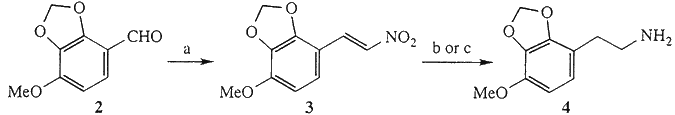 As shown in Scheme 1, the nitrostyrene (3) was obtained by the reaction of 4-methoxy- 2,3-methylenedioxybenzaldehyde1b,c (2) with MeNO2. lt was reduced to the amine (4) hydrochloride by catalytic hydrogenation in a MeOH and 1N HCl mixture over 10% Pd/C catalyst with a yield of 67%. Because of the insolubility of 3 in solvents commonly used for catalytic hydrogenation, this method for the reduction of nitrostyrene (3) on a larger scale could not be applied. Alternatively, the reduction could be done with LiAlH4 in dry THF.