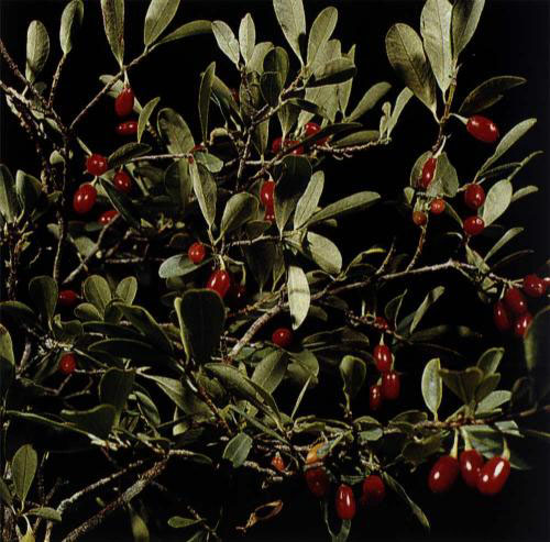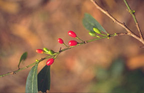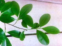 The leaves are lively green, or greenish brown, and clear brown, smooth, slightly glossy, opaque, oval or elliptical, and more or less tapering at the extremities. The leaves are 1.5 to 3 cm wide, and .5 to 11 cm long. A special characteristic of the leaf is an areolate portion bounded by two longitudinal curved lines one on each side of the midrib, and more evident on the under face. The taste is bitter and faintly aromatic. Dried leaves are uncurled, deep green on the upper surface, grey-green on the lower, and have a strong tea-like odour. The flowers are succeeded by red berries. These fruits are drupaceous, oblong, measuring around 1 cm; these produce only one seed (monospermous). The main characteristic of the plant is the perennial renewal of the branches, after cutting, in a geometrical progression.