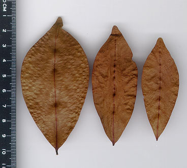 Leaves very variable in size and shape, even on the same twig, mostly obovate, elliptic or oblong, c. (3-)5-11(-18) by 2-3(-7) cm; dark green to greenish brown often shining above, dull light green beneath, shortly acuminate or rounded with a more or less emarginate, mostly mucronate tip, base attenuate or cuneate; midrib nearly always sunken above, very prominent beneath; nerves on both sides equally distinct, often almost horizontal and close together giving a dense nervation, venation delicate; areolation often distinct; petiole 2-7(-9) mm.