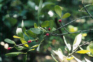 Branchlets reddish-brown with numerous lenttcels. Prominent stipules enclosing terminal buds, soon shed, their scars encircling the twigs. Leaves small, hairless, thin, 1.5-3 cm long, elliptic to obovate, blunt or rounded at the apex, dull green above, paler below with prominent lateral veins; margins thickened and bent under. Fruit a red drupe, to 7 mm long. Some alkaloid bases found present besides Meteloidine, Dihydroxy or Trihydroxy Tropanes.
