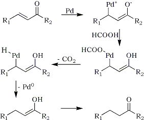 The selective reduction of double bond in conjugated carbonyl compound is a challenging task because of the competing reduction process of carbonyl functionalities. Ram and Spicer11 reported the reduction of double bond in conjugated carboxylic ester with ammonium formate in combination with 5% Pd on charcoal in acetic acid at 110°C. The reactions are very rapid and high-yielding. Conjugated nitriles are also reduced to the corresponding saturated compounds by this procedure. The results are summarized in Table 5. A possible mechanism for this transfer hydrogenation is proposed as in Scheme 1.