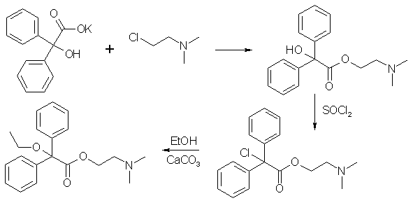 The sodium or potassium salt of benzilic acid was prepared, and reacted with 2-(dimethylamino)-ethyl chloride to form the benzilic acid ester, which was then reacted with thionyl chloride (SOCl2) to give diphenylchloroacetic acid 2-(dimethylamino)-ethyl ester hydrochloride.