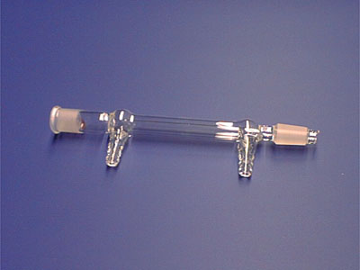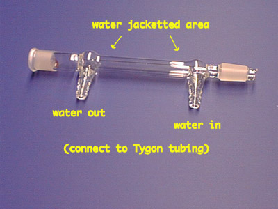 The condensor is used in both reflux and distillation procedures as to cool and condense vapors. The connectors which are on the bottom of the above photo connect to Tygon tubing, which in turn connects to cold water from the sink and to the drain. Between these two connections, the glassware forms an area called a "water jacket".