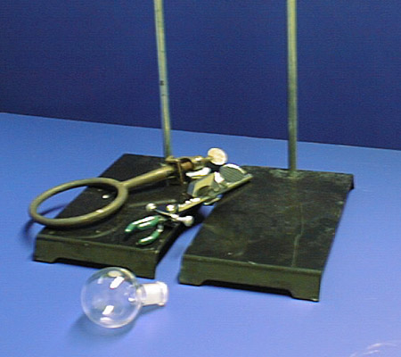 Round bottom flasks are part of your drawer equipment. It will be held in place in the set-up with a small three-pronged clamp with holder which is also in your lab drawer. Grab two ring stands from the back shelves. Obtain a ring clamp (in a box on the back shelves) and two ring stands (back shelves). The ring clamp will hold the heat source, either a steam bath or a heating mantle. |