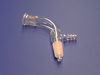 A "bent adaptor" would serve the same purpose in a simple or fractional distillation. A bent adaptor does not have the connection to a vacuum source, which is on the right hand side in the above photo. The advantage of a vacuum adaptor over a bent adaptor is the ability to serve not only in simple or fractional distillations, but in a "vacuum distillation". If the lower joint is connected to a round bottom flask, the system is closed to the atmosphere and can be connected to a vacuum source to create a distillation set-up under reduced pressure. This is illustrated in the figure below:
