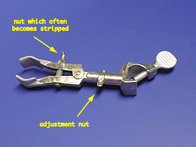 The wing nut on the clamp part often becomes stripped and the clamp no longer will stay closed. If your clamp does not work, try a new wing nut first: they are located on the cart in the front of the stockroom.