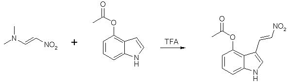 To a solution of 175 mg (1.0 mmole) of 4-acetoxyindole in 1 ml of trifluoroacetic acid was added 116 mg (1 mmole) of 1-dimethylamino-2-nitroethylene. The reaction mixture was heated at 55°C under a nitrogen atmosphere for 10 minutes during which time the light yellow solution became dark red. The reaction was cooled to room temperature and the solvent distilled under reduced pressure. The resulting red oil was dissolved in 2 ml of chloroform and the solvent removed in vacuo. This was repeated with 3 ml of dioxane. Addition of 1 ml of ethyl acetate and scratching induced crystallization of the residue. Hexane (0.25 ml) was added and the yellow needles collected by filtration and dried in vacuo to give 191 mg of 3-(2-Nitrovinyl)-4-acetoxy-indole (78%), mp 200-203°C (dec). Ref: J. Heterocyclic. Chem. 18, 175 (1981) 3-(2-Nitrovinyl)-4-acetoxyindole (335 mg, 1.36 mmoles) was dissolved in 4 ml of tetrahydrofuran and added to a stirred suspension of 300 mg (7.89 mmoles) of lithium aluminum hydride in 5 ml of tetrahydrofuran. After the addition the reaction was refluxed for 20 minutes, cooled to room temperature, and water added dropwise until gas evolution ceased. The mixture was filtered (Celite, dry nitrogen atmosphere) and the filtrate concentrated under reduced pressure. The resulting clear syrup (slight blue tinge) was dissolved in a mixture of 5 ml of pyridine and 3 ml of acetic anhydride. After standing overnight at room temperature the solvents were distilled under reduced pressure and the residue purified by preparative thin-layer chromatography in 5% methanol in chloroform. The eluted (ethyl acetate) product was crystallized from ethyl acetate/hexane to give 94 mg (26%), mp 150°C. Ref: J. Heterocyclic. Chem. 18, 175 (1981) N,N-dimethylformamide and dimethylsulfate complex