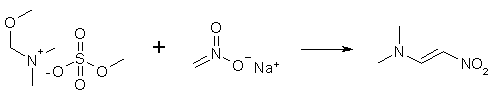 To a solution of 2.3 grams of sodium metal in 100 ml of absolute ethanol, 20g of DMF/Me2SO4 complex and 6.1 grams of nitromethane is added. The mixture is heated to a boil for 1-2 minutes, cooled to room temperature, and the solvent was then evaporated in vacuum. The mixture is then extracted with methylene chloride, the solvent is again evaporated in vacuum, and the residue is washed with cold isopropanol, and then recrystallized from the same solvent. The yield is 60% of melting point 104°C. Ref: Ber 98, 3847 (1965) 1-Dimethylamino-2-nitropropeneA solution of 10 grams of sodium metal in 500ml of absolute ethanol is cooled to 10°C and 90 grams of DMF/Me2SO4 complex and 47.5 grams of nitroethane is added. The solution is shaken with cooling for five minutes, and the solution takes on a orange-red color. The solvent is removed at 30-35°C in a rotavap, and the solid yellow residue is extracted with methylene chloride, and the solvent is again removed under vacuum. The orange-red oily residue is cooled in the fridge, whereupon it crystallizes. The crystals are washed with a small amount of cold ether, and are recrystallized from ethanol to give yellow crystals with a melting point of 78°C in a yield of 73% of theory. Ref: Ber 107, 1499 (1974) Addendum by Cesium: 1-dimethylamino-2-nitroethylene CA SEARCH 1982-7/2000 100:22856 The chemistry of indoles. XIX. Synthetic study directed toward cyclopiazonic acid. Chem. Pharm. Bull., 31(6), 2153-6 (English) 1983. 97:216537 Psilocine analogs. III. Synthesis of 5-methoxy- and 5-hydroxy-1,2,3,4-tetrahydro-9H-pyrido[3,4-b]indoles. J. Heterocycl. Chem., 19(4), 845-8 (English) 1982. 96:104201 Synthesis of 1H-[1,2]diazepino[4,5-b]indole derivatives. J. Heterocycl. Chem., 18(5), 889-92 (English) 1981. 120:77615 2-Substituted 5-methoxy-N-acyltryptamines: synthesis, binding affinity for the melatonin receptor, and evaluation of the biological activity. J. Med. Chem., 36(25), 4069-74 (English) 1993. 121:9157 Tryptamines for treatment of circadian rhythm disorders. EP 93-830269 24 Jun 1993 Unfortunatelly, all with trifluoroacetic acid as a solvent :-( |