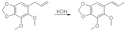 500mls of dillapiole [1] was refluxed with 10g of 85% KOH under medium vacuum for 11 hours, then transferred to a vacuum distillation rig and 450ml of iso-dillapiole was recovered at bp 145-146°C/6mmHg, it was recrystallized from an equivalent volume of boiling petroleum ether, yeilding 410g of clear 1-2 cm long prisms with a mp of 38°C [2]. 2,3-Dimethoxy-4,5-Methylenedioxy-Phenyl-2-Propanone