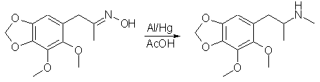 14g of Al (Heavy duty Reynolds) was amalgamated in 400mls MeOH and 50mg Hg2Cl2 by heating to reflux. The flask was fitted with a reflux condenser and was then transferred to a cold stirrer, 18.3g ketone and 13.7g MeNO2 in 50mls MeOH were then added dropwise over 15 minutes [5]. The rxn was allopwed to stir overnight. 500mls 50% NaOH was slowly added, then extracted with 400mls toluene followed by a 150ml extraction. Pooled extracts, and washed twice with H2O and once with brine, dried through MgSO4, and gassed yeilding 15.5g of DMMDMA-2 [6] with a melting point of 147-148°C [2]. Oxime of 2,3-Dimethoxy-4,5-Methylenedioxy-Phenyl-2-Propanone