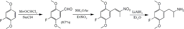 The 2-fluorohydroquinone is methylated with dimethyl sulfate in aqueous NaOH to afford 2,5-dimethoxyfluorobenzene, which upon Friedel-Crafts formylation with α,α-dichloromethyl methyl ether with tin(IV)chloride as catalyst leads exclusively to 2,5-dimethoxy-4-fluorobenzaldehyde. Condensation of the aldehyde with nitroethane under standard conditions gives the corresponding nitroalkene, which in turn is reduced by etheral LiAlH4 to give 2,5-Dimethoxy-4-Fluoroamphetamine Hydrochloride (DOF·HCl) in high yield.