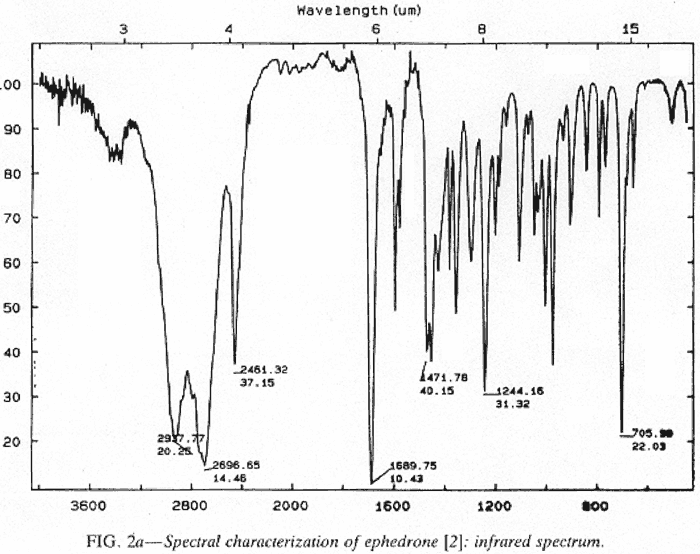 The foregoing results confirm that the permanganate oxidation product of ephedrine is 2-methylamino-1-phenylpropan-1-one, referred to by its street names Ephedrone and Jeff. The spectral data have been included (see Fig. 2) for forensic usefulness.
