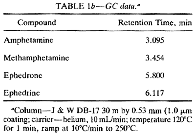 All the chemicals used were analytical grade. The ephedrine hydrochloride and pseudoephedrine hydrochloride were obtained from Aldrich Chemical Co. (Milwaukee, Wisconsin), Gas-liquid chromatography (GLC) was performed on a Hewlett-Packard Model 5890 instrument (Palo Alto, California), Ther capillary column was a J&W DB-17 cross-linked methyl silicone column, 30 m by 0.53 mm inside diameter (ID), with a 1.0 µm film thickness. Helium was the carrier gas in the capillary column (with a linear velocity of 30 cm/s, and nitrogen-phosphorus detector (NPD) was used to generate the signal.