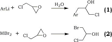 Similar reactions employing grignard reagents have been carried out with epichlorohydrin to give generally unsatisfactory conversions to the desired products. The best yield of 1-chloro-3-phenyl-2-propanol prepared from phenylmagnesium bromide was 18.2%3.