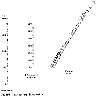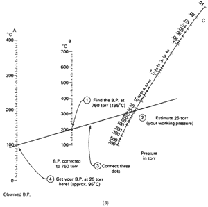 The pressure-temperature nomograph (Fig. 103) is really just a simple, graphical application of the Clausius-Clapeyron equation. If you know the heat of vaporization of a substance, as well as its normal boiling point, you can calculate the boiling point at another temperature. You do have to assume that the heat of vaporization is constant over the temperature range you're working with, and that's not always so. Where's the heat of vaporization in the nomograph? One is built into the slope and spacings on the paper. And, yes, that means that the heat of vaporization is forced to be the same for all compounds, be they alkanes, aldehydes, or ethers. So do not be surprised at the inaccuracies in this nomograph, be amazed that it works as well as it does.