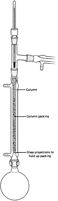 For separation of liquids that are soluble in each other, that boil fewer than 25°C from each other, use fractional distillation. This is like simple distillation with the changes shown (Fig. 106).