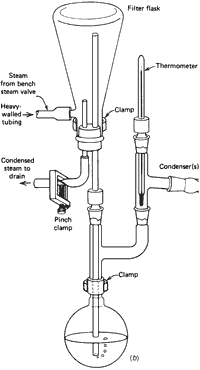 You can use many types of steam traps with your distillation setup. I've shown two (Fig. 107a/107b), but these are not the only ones, and you may use something different. The point is to note the steam inlet and the trap drain, and how to use them.