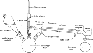OK, you set all this stuff up to do a distillation. Everything's going fine. Clamps in the right place. No arthritic joints, even the vacuum adapter is clamped on, and the thermometer is at the right height. There's a bright golden haze on the meadow, and everything's going your way. So, you begin to boil the liquid. You even remembered the boiling stone, Boiling starts slowly, then more rapidly. You think, "This is it!" Read that temperature, now. Into the notebook: "The mixture started boiling at 26°C."