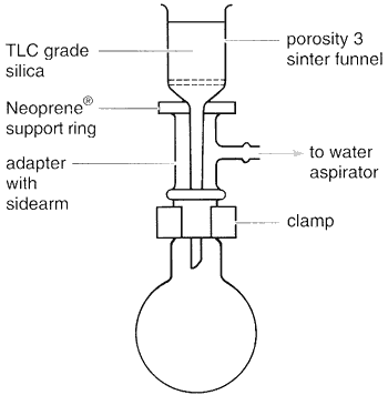The silica used for this type of chromatography is TLC grade silica without the gypsum binder. This is cheaper than the silica sold for use in flash chromatography which, in any case, is too free flowing for use in these dry columns. The weight of silica recommended for each size of funnel is sufficient to leaven head space at the top of the funnel for loading solvent when the column has been packed and compacted under suction. The silica may be weighed out as indicated in the table, but it is easier just to fill the funnel to the brim with lightly packed silica. Application of suction causes the silica to compact, leaving the head space for solvent addition. During this initial compaction there is a tendency, particularly with the larger sized columns, for the silicate shrink away from the sides of the funnel or to form cracks which may remain unseen in the body of the adsorbant. To ensure good packing, press down firmly on the surface with a glass stopper, particularly at the edges, using a grinding motion. Do not worry about the state of the adsorbant surface as this can be flattened off easily when finished by repeated gentle tapping around the sides of the funnel with a spatula.