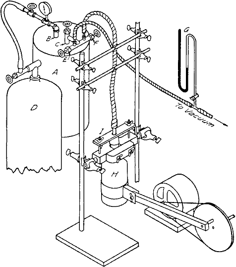 Catalytic Hydrogenation Apparatusfrom Organic Syntheses, CV 1, 61[ Back to the Chemistry Archive ] 1. Procedure(A) Apparatus. A Prest-o-lite tank A from which the filling has been removed (Note 1), or any other similar tank of about 8- to 10-l. capacity, may be conveniently used as a container for hydrogen. The top of the tank contains two openings B and C. In B is welded a tube holding a gauge and valve, and through this tube the hydrogen from a large cylinder D is introduced into the tank. In C is welded another tube controlled by a needle valve. E is used for the vacuum, a manometer G being introduced into this system, and F for a tube leading to the reaction bottle H. These outlets are so arranged that it is possible to shut off the tank from either outlet and also to make a direct connection between the vacuum and the bottle H, leaving tank A out of the circuit. The connection between the tank A and the bottle H is a heavy taped rubber tube (Note 2) which is in turn connected to a glass tube inserted through the stopper of the bottle. The rubber tube and stopper should be of high grade and must be carefully boiled with alkali before being used (Note 3). The arrangement for shaking the bottle is shown in the diagram (Note 4). The driving pulley is connected to the reaction bottle by a wooden or preferably a metal rod. The rod in turn is attached by a yoke to a metal ring which circles the bottom of the bottle. The ring opens on the back side of the bottle and is held together by a wing-nut and bolt. In order to hold the stopper in the bottle when the latter is filled with hydrogen under pressure, a metal strip I is clamped tightly over the stopper. This strip is screwed to the long wooden bottle holder which extends between the bearings, and a short wooden piece which fits around the neck of the bottle is attached to the longer one by means of screws held by wingnuts. This arrangement permits removal of the bottle from the apparatus without detaching the metal strip.