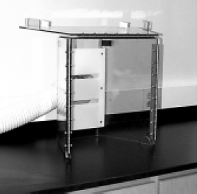 As part of the recent renovation of our undergraduate chemistry laboratories, we were faced with the problem of what to do about hood facilities for the general chemistry laboratories. We wished to have hoods available for all students, but because these would be used only occasionally, installation of full-size hoods was not considered either cost or space effective. The alternative was small bench-top hoods, but other criteria, including ease of storage, flexibility of location, and visibility throughout the laboratory made the commercially available units that we could find unsatisfactory1. None of the commercial designs offered easy storage (unless they were very small to begin with) or the ability to take up minimal bench space while still being functional. In the end, we designed our own and will describe it here for anyone who has similar requirements.