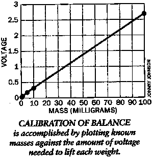 The device uses two precision, 100kilohm, 10-turn, variable resistors (also called potentiometers or rheostats) - the first to adjust the voltage across the coil and the second to provide a zero reference. A 20-microfarad capacitor buffers the coil against any jerkiness in the resistors' response and helps in making any delicate adjustments to the needle's position. To measure the voltage across the coil, you'll need a digital voltmeter that reads down to 0.1 millivolt. Radio Shack sells handheld versions for less than $80. Using a five-volt power supply, Schmermund's scale can lift 150 milligrams. For larger weights, replace the type 7805 voltage-regulator chip with a 7812 chip. It will produce a stable 12 volts and will lift objects weighing nearly half a gram. To calibrate the scale, you'll need a set of known microgram weights. A single high-precision calibrated weight between one and 100 micrograms typically costs $75, and you'll need at least two. There is, however, a cheaper way. The Society for Amateur Scientists is making available for $10 sets of two calibrated microgram weights suitable for this project. Note that these two weights enable you to calibrate your balance with four known masses: zero, weight one, weight two and the sum of the two weights. To make a measurement, begin with the scale pan empty. Cover the device with the glass enclosure. Choke down the electric current by setting the first resistor to its highest value. Next, adjust the second resistor until the voltage reads as close to zero as you can set it. Write down this voltage and don't touch this resistor again until you have finished your entire set of measurements. Now turn up the first resistor until the needle sinks down to the lower stop, then turn it back so that the needle returns to the zero mark. Note the voltage reading again. Use the average of three voltage measurements to define the zero point of the scale.