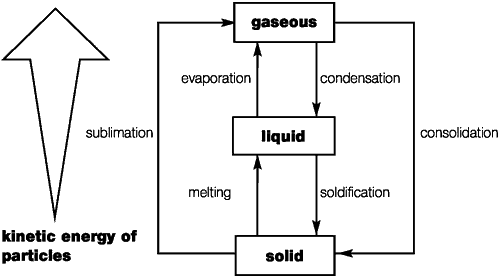 If the state of aggregation changes from solid to liquid, we talk of melting; in the reverse case we speak of solidification. Changing from the liquid to gaseous state is called evaporation or boiling; the reverse is known as condensation or liquefaction.