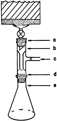 bleed. c) Tygon tubing. d) Glass tubing. e) Rubber stopper.