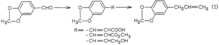 The one natural oil that has been omitted is croweacin, or 2-methoxy-3,4-methylenedioxyallylbenzene. In its one reported synthesis1, only a mixture of isomers was obtained. A separate synthetic approach, paralleling the reported conversion2 of piperonal to safrole (eqn. 1), would allow croweacin to be prepared from the readily available 2-methoxy-3,4-methylenedioxybenzaldehyde.