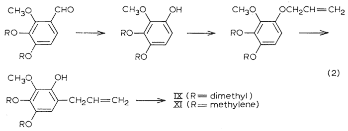 The two tetraalkoxy materials remaining (tetramethoxyallylbenzene IX and dillapiole XI) were synthesized in accordance to eqn. 2. The peracetic acid oxidation of the trialkoxybenzaldehydes, and the subsequent steps of ether formation and Claisen rearrangement followed the specific directions given for the corresponding conversions with dialkoxybenzaldehydes4.