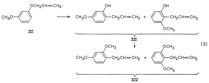 The synthesis of 2,4-dimethoxyallylbenzene, precursor to nothosmyrnol, was complicated by the formation of isomers (eqn. 3). In the previously reported syntheses5 that employ the Claisen rearrangement of allyl m-methoxyphenyl ether (XII), the product had been assigned the structure that would have resulted had the migration occurred exclusively to the unhindered ortho-position, More recently, the reaction has been shown to occur to both ortho-positions, and indirect (isotope dilution) technique has indicated 2:1 ratio of isomers favoring the unhindered positions. GLC analysis (Apiezon L, 20 ft. column, see below) of both the rearrangement phenol XIII and its methyl ether XIV showed the presence of two components in the ratio of 4:6 in the order of emergence. The earlier (and lesser) phenol was isolated and methylated to provide the earlier (and lesser) dimethoxyallylbenzene. This is the 2,6-dimethoxy isomerb, and the later peak, the 2,4-isomer (IIa), was isolated from the mixture XIV by preparative chromatography to provide the sample employed in isomerization to nothosmyrnolc.