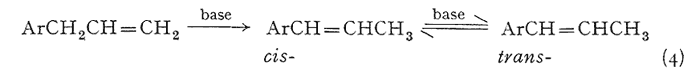 An effective and general tool can be derived immediately by the combination of this consistency of emergence with the isomerization properties of the allyl group. The base-catalyzed rearrangement of the allyl system to a mixture of the cis- and trans-forms of the propenyl counterpart has been mentioned above. The trans- is always favored, and the ratio of it to the cis- is given in Table III. It has been observed that this same end distribution is approached, although more slowly, by the rearrangement of either pure cis- or pure trans-propenyl material, in accordance with eqn. 4. Thus an unknown component isolated from a mixture may be readily assigned its chain configuration by comparing its time of emergence before and after treatment with alcoholic KOH, Five milligrams has proved to be quite sufficient for this purpose, employing the techniques described in the experiment section. The results of before and after are shown in Fig. 2, which presents the patterns observed with each of the three possible identities. Two complications have appeared and must he guarded against. The rearrangement of a trans-propenyl to the equilibrium mixture of cis- and trans- (the bottom presentation of Fig. 2) can be very slow, a period of several days being necessary to firmly establish the fore-running cis-component, Secondly, the protracted treatment of a methylenedioxy containing compound with alcoholic base leads to slow opening of this ring in accordance with eqn. 5.