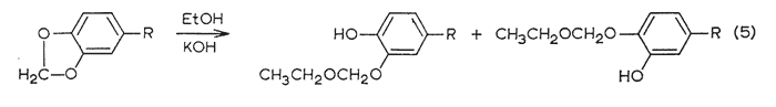 These open-chain methylene ethers are quite stable to GLC conditions and represent extremely slowly moving phenolic components in the analysis mixture. Thus in a trial with pure trans-isosafrole (IVc), concurrently with the generation of the cis-isosafrole was the appearance of a very slow moving pair of peaks of approximately equal areas, However, there was sufficient cis-isosafrole formed to permit certain assignment.