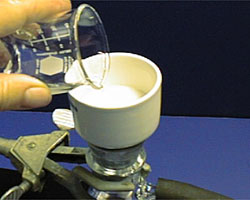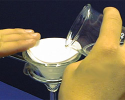 | Watch that particulates do not creep under the edges of the paper. If this happens, start over and carefully pour portions of the solution onto the very center of the paper. | Notice that the vacuum has pulled the solvent through the filter and into the filter flask. | |||||