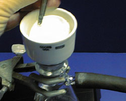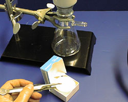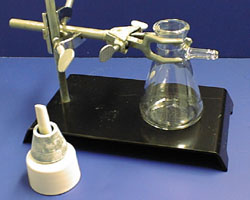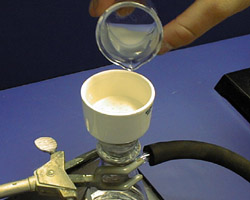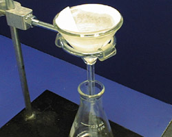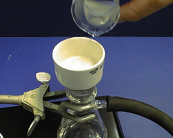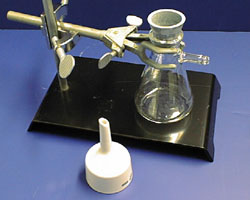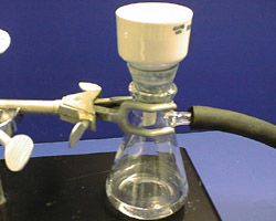 Make sure that the paper is secure on the filter, that air is being drawn through the paper, and that all of your apparatus is securely clamped. If you are using a Neoprene filter adaptor, you might need to press on the funnel to engage the seal and thus the vacuum. Now you are ready to begin filtration. |