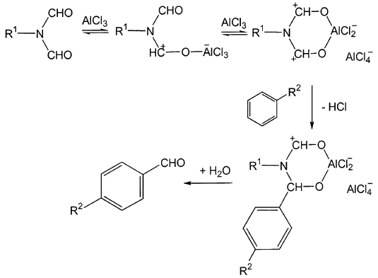 Notes[a] With respect to 2.[b] Product is 3,4-dimethylbenzaldehyde. Yield calculated for transfer of 3 formyl groups per molecule 2. [c] Aged AlCl3 (partially hydrolyzed by repeated opening of the container). [d] 1,2-Bis(3,4-dimethyphenyl)ethane (3 %) was obtained as a by-product. [e] Reaction performed without additional solvent. The reaction features a high para selectivity in the substrate, consistent with the high steric bulk of the attacking species. As can be appreciated from Table 1 and Table 2, in order to achieve satisfactory yields with formamide derivatives bearing one or more diformylamino groups, it is necessary to use at least 2 equiv. of Lewis acid. It is hence very likely that the primary adduct reacts with further Lewis acid to form the formylating species. Lastly, we emphasize that the method we have presented can be performed using only stoichiometric amounts of the formamide derivative, and 2 equiv. of Lewis acid per formyl group transferred. E-factors (kg of waste per kg of product) of the new formylation procedures are in the range from 4 to 11; further investigations will show whether these values can be reduced by use of other types of catalysts. The comparable method with dichloromethyl methyl ether often employs a large excess of the formylating mixture (up to 18 equiv.),[16,17] and the regioselectivity is rather low.[18] Formylation with Other Formamide DerivativesThe perchlorinated derivative of triformamide, tris(dichloromethyl)amine (3),[12] can be prepared from N,N-dimethylformamide and phosgene, followed by photochlorination of the resulting N,N-dimethylformamide chloride. In the presence of various Lewis and Brøønsted acids, 3 also proves to be a good formylating agent, and it is suitable for the formylation of a wide range of aromatic compounds.[8] Thus, toluene reacts with 3/AlCl3 to give tolualdehyde, in a yield of 70% and a p/o ratio of 30:1. Similarly, anisaldehyde can be prepared from anisole and 3/ZnCl2 in 62% yield (p/o 24:1) (see Exp. Sect.). However, this complex subject will be dealt with in more detail in a forthcoming paper. Preliminary studies on the formylating ability of another formamide derivative, N,N,N,N-tetraformylhydrazine (4), are also encouraging.[19,20] ConclusionArene formylation can conveniently be carried out in satisfactory yields with formamide derivatives in the presence of Lewis acids. Quantum chemical calculations provide cogent indications of the nature of the electrophilic species involved in this reaction. Thus, in the attack by a proton or by AlCl3 (protonation or Lewis acid adduct formation, respectively), the amide oxygen atom is the most basic site, both in the gas phase and in water or DCE as solvents. The formation of a chelate complex between the two adjacent carbonyl oxygen atoms in a diformamide group and AlCl3 is also supported. All these results reinforce the proposition that the attacking electrophilic species is formed by attachment of the Lewis acid to the oxygen atom of the formamide derivatives, and endorse the proposed reaction mechanism (Scheme 5).