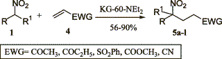 1-Nitropropane [187 mg, 2.1 mmol, (4.2 mmol when the starting nitroalkane is nitroethane)] was mixed with methyl vinyl ketone (122 mg, 2.1 mmol), then, the catalyst KG-60-NEt2 (0.42 g) was added. After standing (stirring can be avoided since it does not change the efficiency of the reaction) at room temperature for the appropriate time (see Table 1) the mixture was extracted with EtOAc (5×20 mL), the catalyst was filtered off, the organic layer was evaporated and the crude product was purified by flash chromatography (cyclohexane/EtOAc, 8:2), affording 247 mg (80%) of the pure 5b. Table 1.
