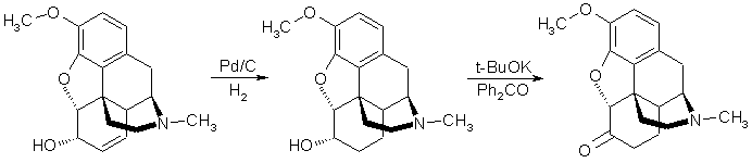 Considerable time was invested in the oxidation step, but the notorious acid-lability of the morphinan skeleton precluded the utilization of any of the alternative methods tested, therefore we focused our attention on streamlining or refining the reported Oppenauer method. In Rapoport's paper1, potassium tert-butoxide was prepared from potassium and tert-butyl alcohol, but instead we utilized a comercially available 1M solution of potassium tert-butoxide in THF, whioch worked very well as long as the THF was completely removed prior to the addition of the oxidation reagents. Also, attempted substitution of toluene for benzene proved unsatisfactorily, only unreacted starting material was recovered. Once the solution of potassium tert-butoxide in benzene was prepared, a solution of codeine and benzophenone was added, and the solution refluxed for a short time, whereupon a standard extraction provided pure hydrocodone in nearly quantitative (99%) yield.